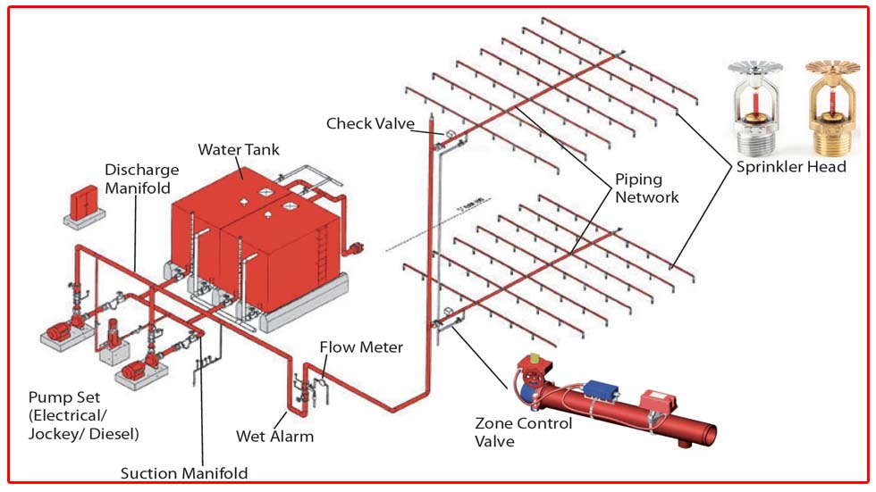A sprinkler system consists of pipes along a ceiling that contain water under pressure, with an additional source of water for a constant flow. Attached to the pipes, automatic sprinklers are placed at select locations. When a fire occurs, a seal in the sprinkler head ruptures at a pre-established temperature, and a steady stream of water flows.